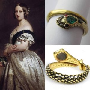 Shaped like a serpent, the ring included small rubies, diamonds, and an emerald, which was Queen Victoria’s birthstone.