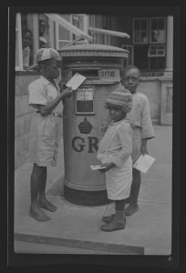 Three Children posting letters at a Pillar Box in Lagos.